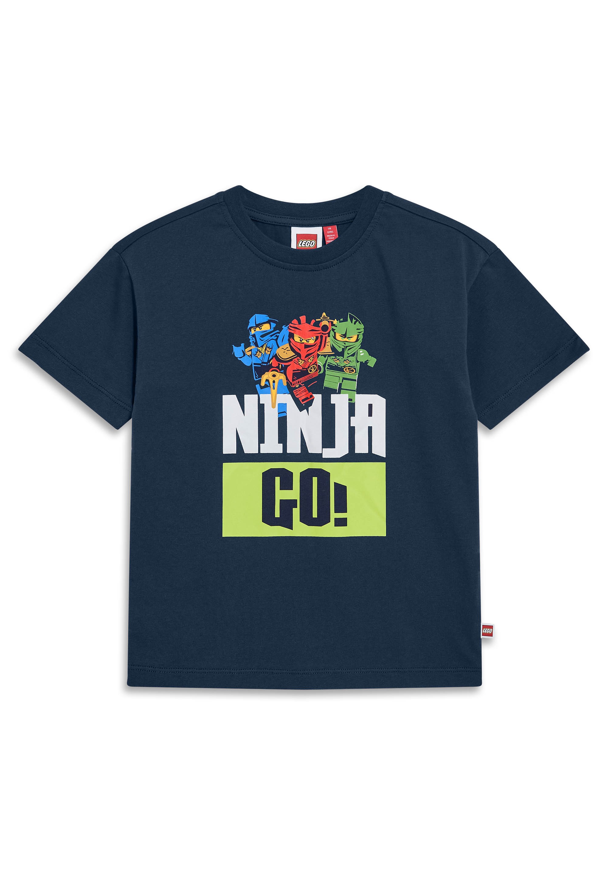 Koszulka LEGO to chłopięcy T-shirt w granatowym kolorze z wyrazistym nadrukiem LEGO NINJAGO. Duża grafika z postaciami ninja i napisem „NINJA GO!” podkręca styl i zachęca do nowych przygód. Miękka bawełniana dzianina klasyczny, prosty krój sprawiają, że wygodnie nosi się ją przez cały dzień — w szkole i w weekend.