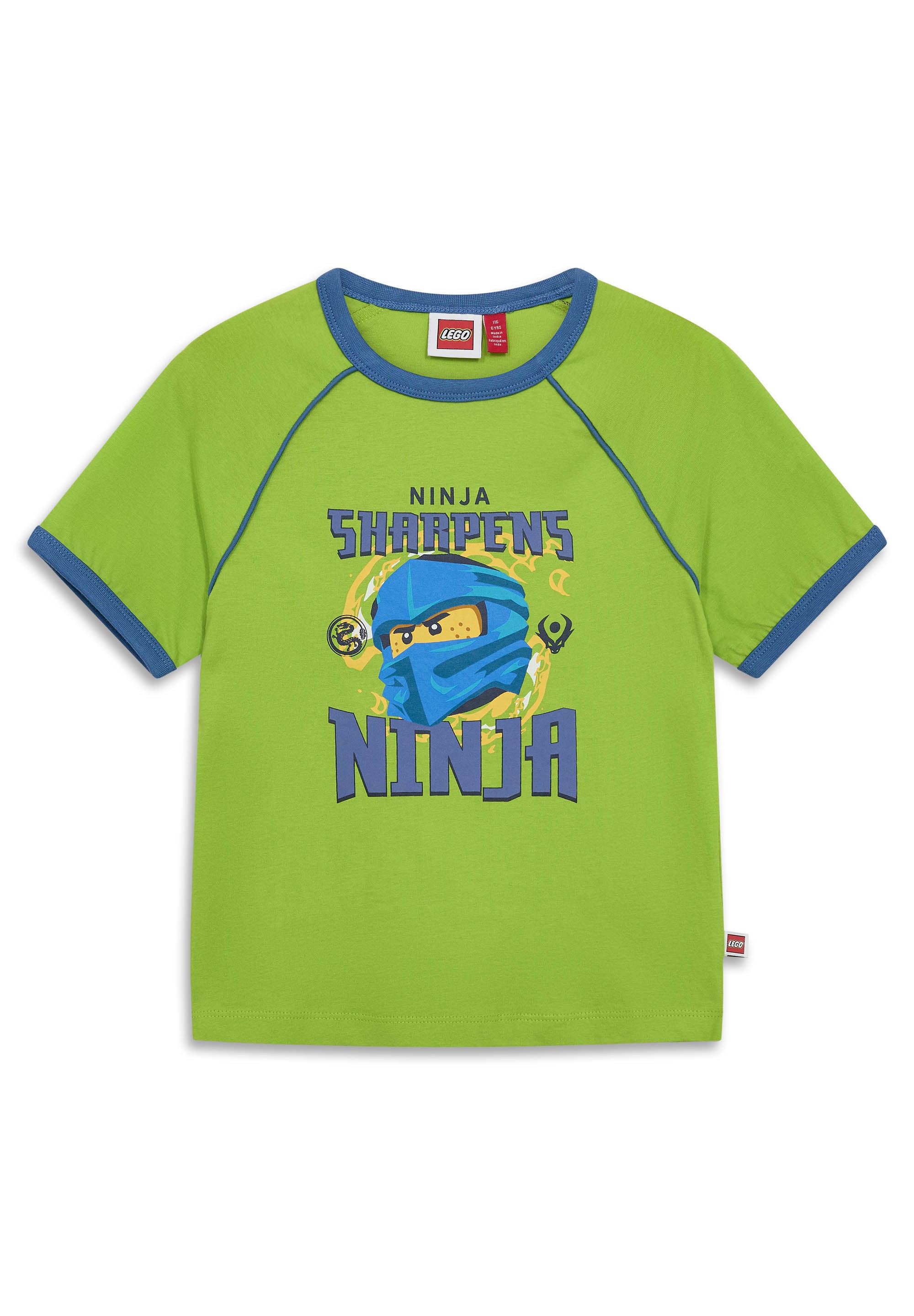 Koszulka LEGO to chłopięca koszulka z krótkim rękawem w limonkowym kolorze, z dużym nadrukiem z ninja Jayem i hasłem „NINJA SHARPENS NINJA”. Sportowy charakter podkreślają raglanowe rękawy oraz kontrastowe, niebieskie lamówki przy dekolcie i mankietach. Miękka bawełna daje wygodę w noszeniu na co dzień i podczas zabawy.