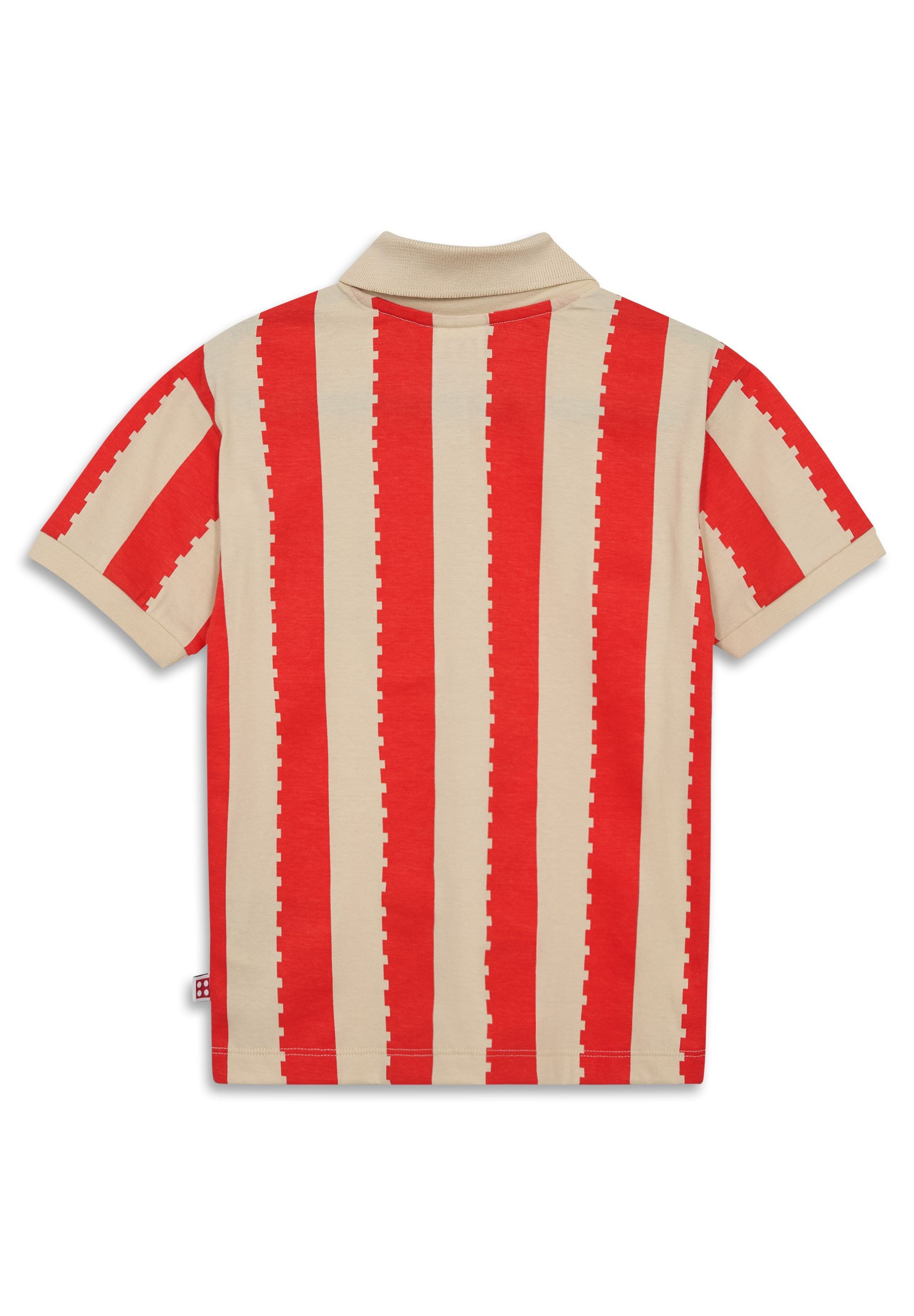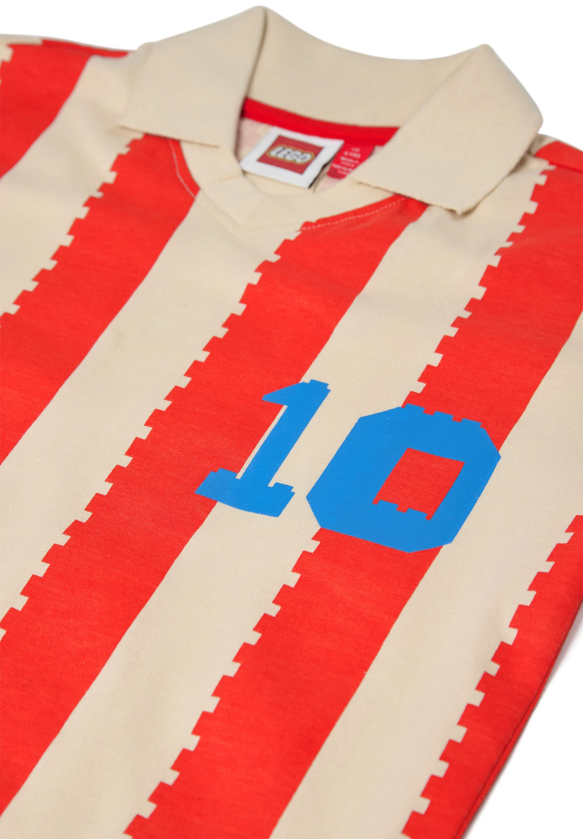 Koszulka LEGO to chłopięcy model z krótkim rękawem, który łączy sportowy charakter z motywem inspirowanym klockami. Czerwono-beżowe pionowe pasy z „klockowym/pikselowym” wykończeniem i niebieska liczba 10 nadają jej wyrazisty wygląd, a kołnierzyk polo w kolorze ecru dodaje sportowo-eleganckiego akcentu. Miękka, przyjemna w dotyku dzianina pomaga utrzymać komfort podczas zabawy i aktywnego dnia.