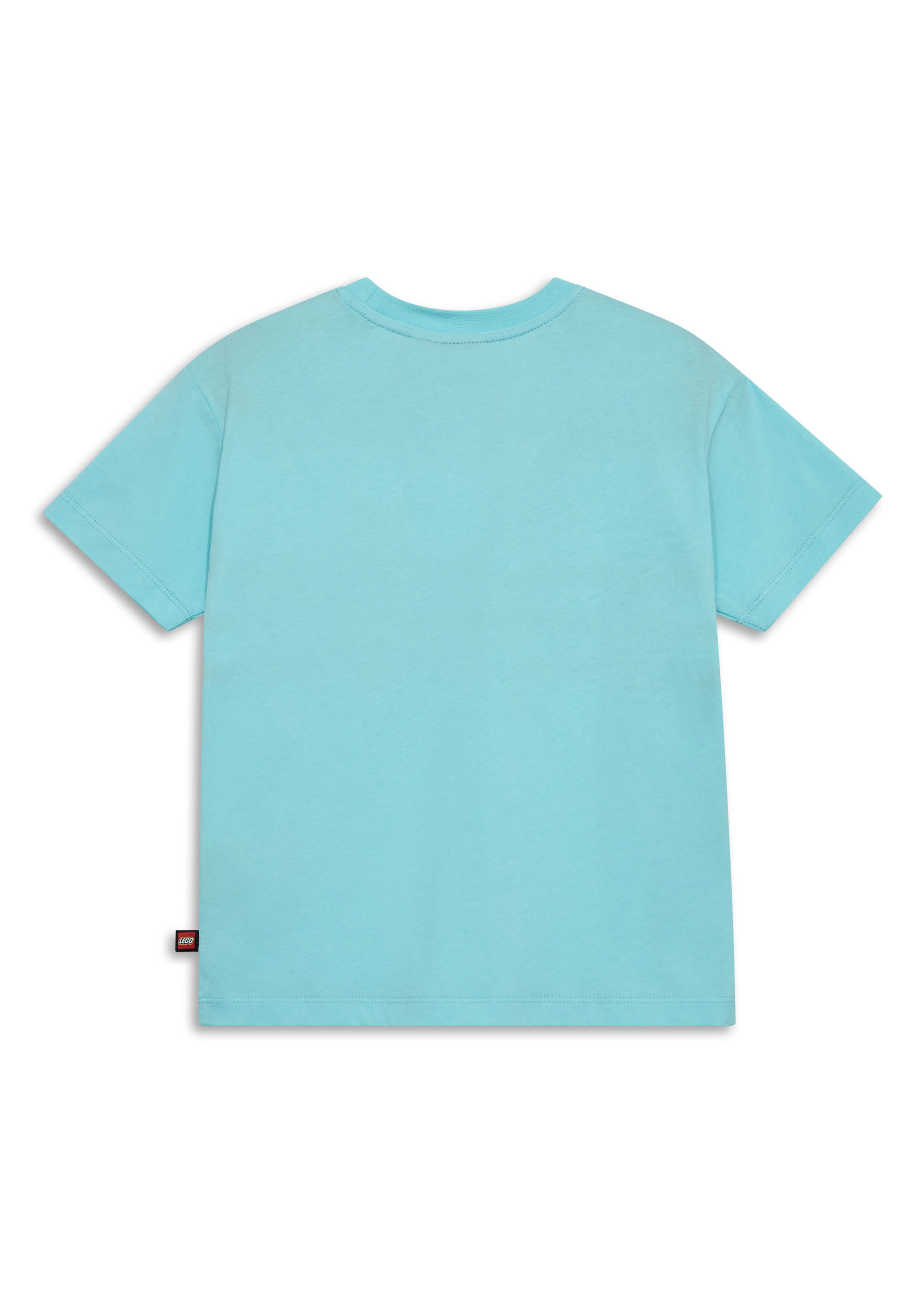 Koszulka LEGO to lekki T-shirt dziecięcy (unisex) o klasycznym, prostym kroju na ciepłe dni i codzienne noszenie. Jasny turkusowy (błękit) z granatowymi pasami w stylu klocków LEGO na klatce piersiowej oraz wyrazisty nadruk z postacią LEGO, rekinem i efektem rozprysku wody nadają jej charakteru. Okrągły dekolt z prążkowanym ściągaczem i krótkie rękawy stawiają na wygodę w ruchu.