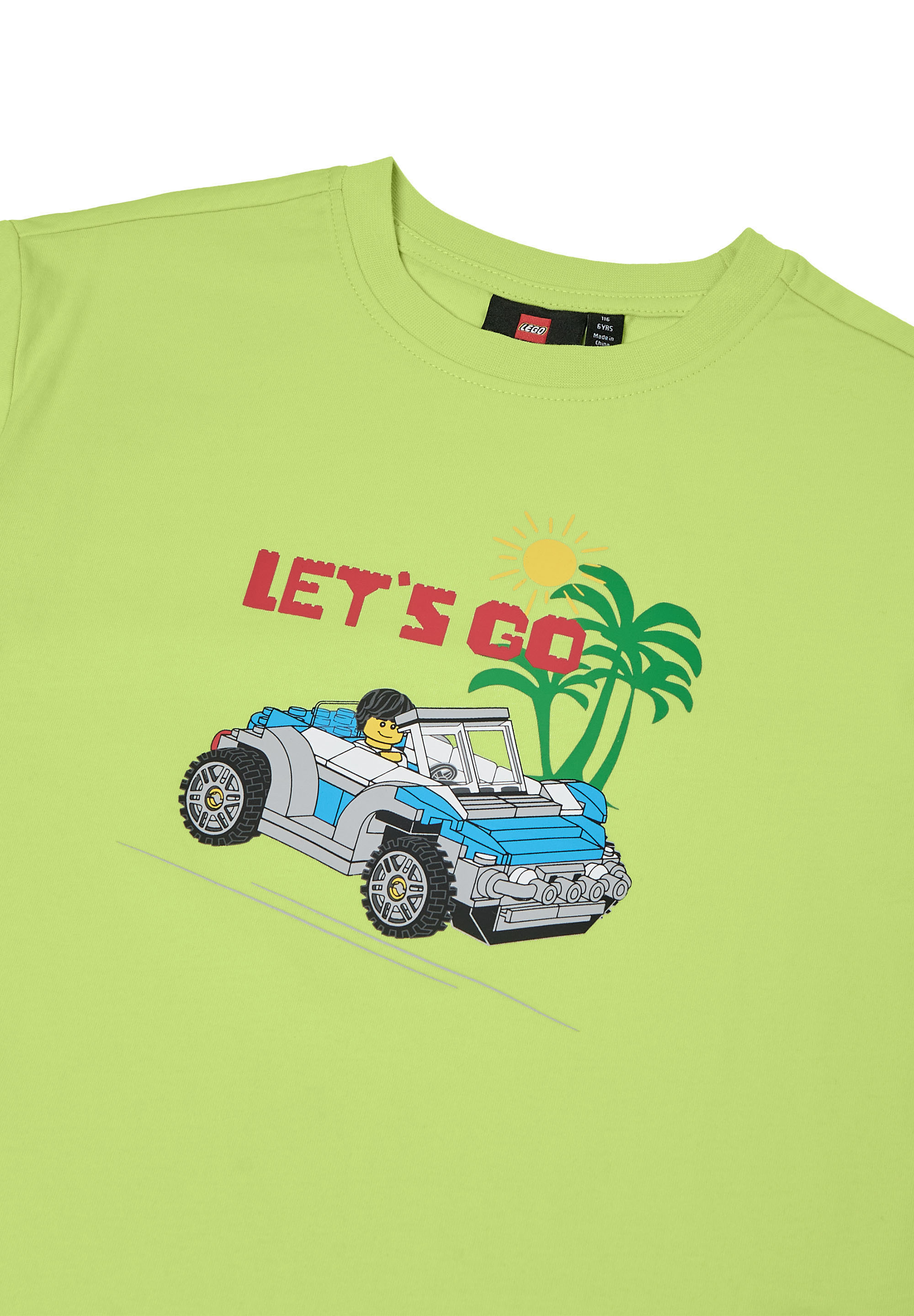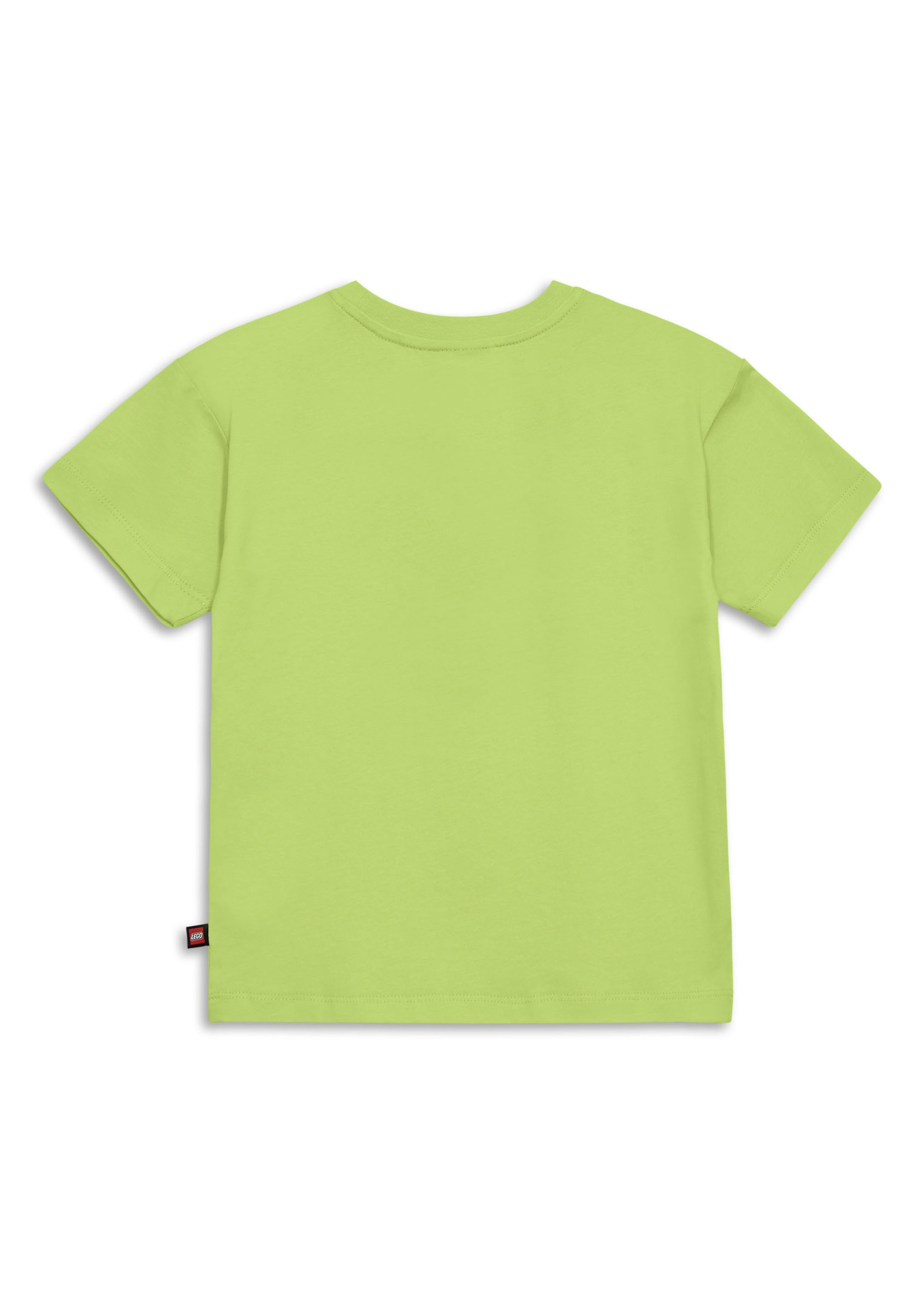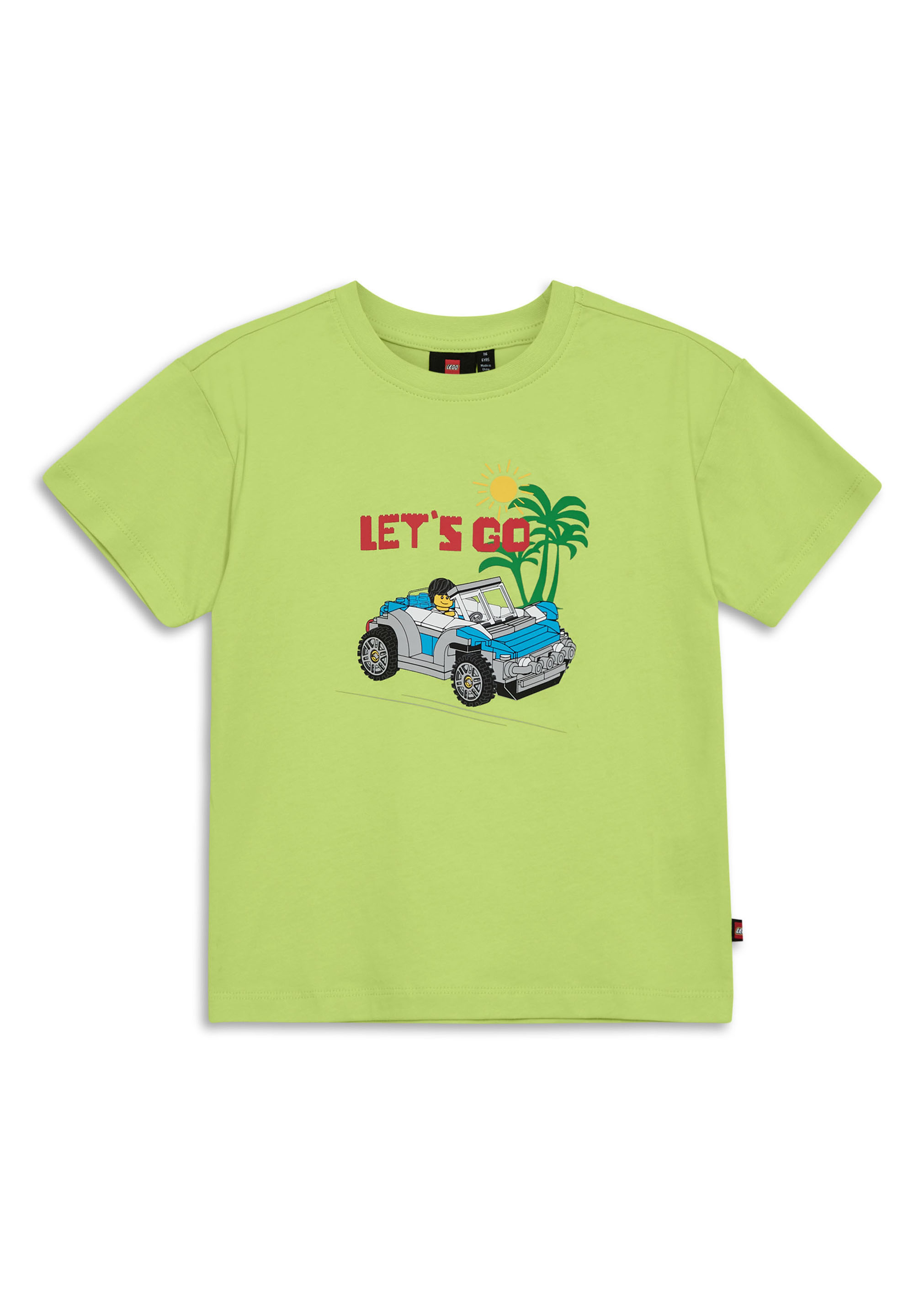 Koszulka LEGO to dziecięcy T-shirt w limonkowo-jasnozielonym kolorze, zaprojektowany z myślą o wygodzie na co dzień. Miękka, gładka dzianina oraz komfortowy, prosty krój z krótkim rękawem dają swobodę ruchu podczas zabawy. Z przodu jest wyrazisty, wielokolorowy nadruk „LET’S GO” z grafiką LEGO (auto, postać, palmy i słońce), a tył pozostaje gładki.