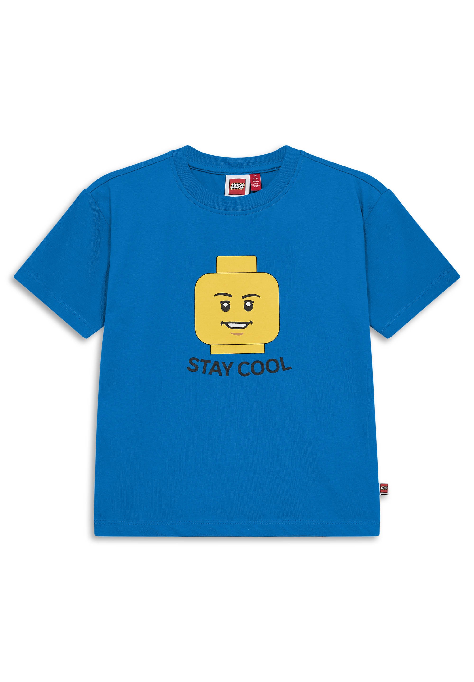 Koszulka LEGO to dziecięcy T-shirt z krótkim rękawem w intensywnym niebieskim kolorze. Z przodu ma duży nadruk żółtej głowy minifigurki z czarnymi detalami oraz napis „STAY COOL”, które nadają jej wyrazisty, rozpoznawalny charakter. Miękka, gładka dzianina klasyczny, prosty krój zapewniają wygodę w szkole, na podwórku i w domu.