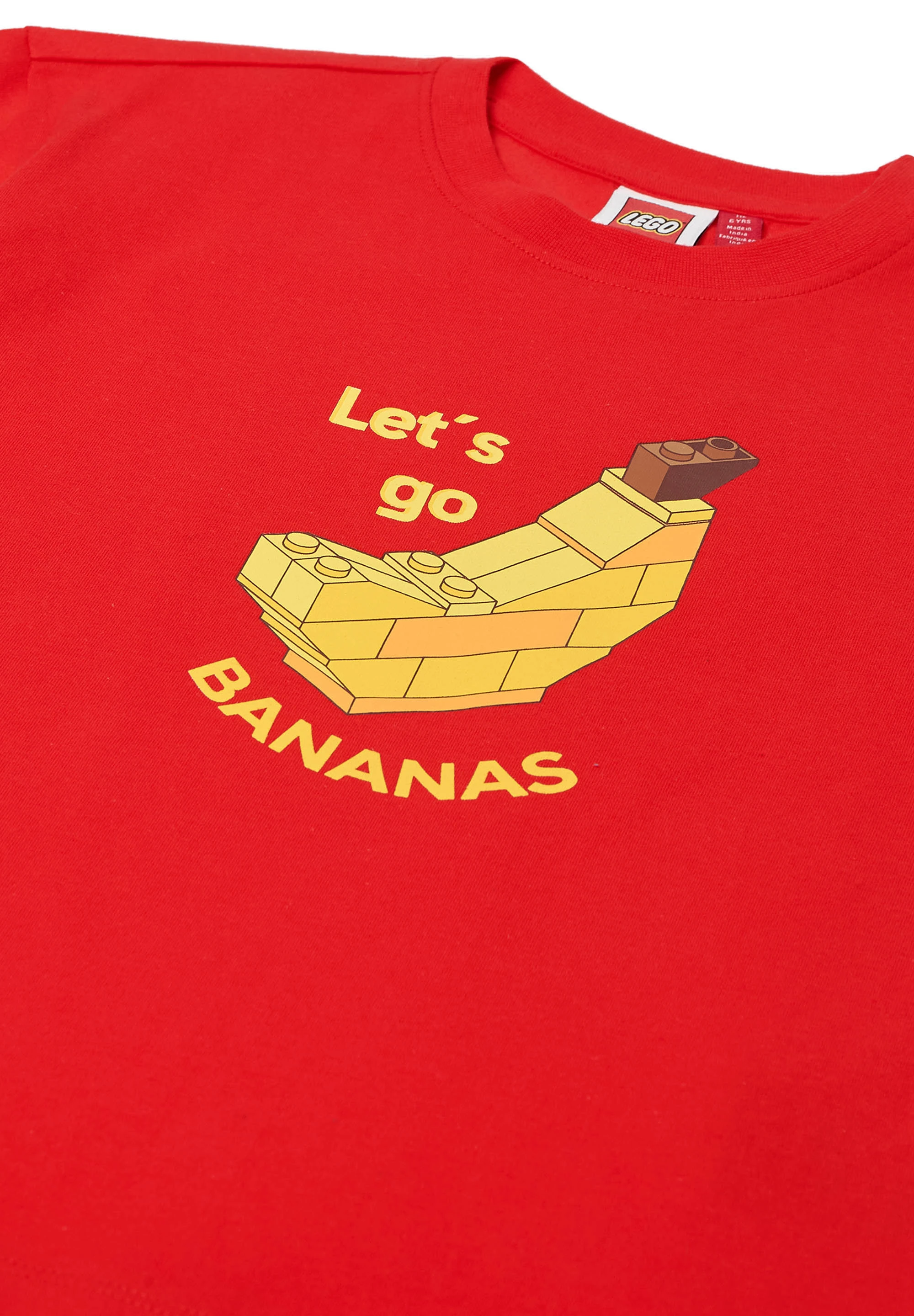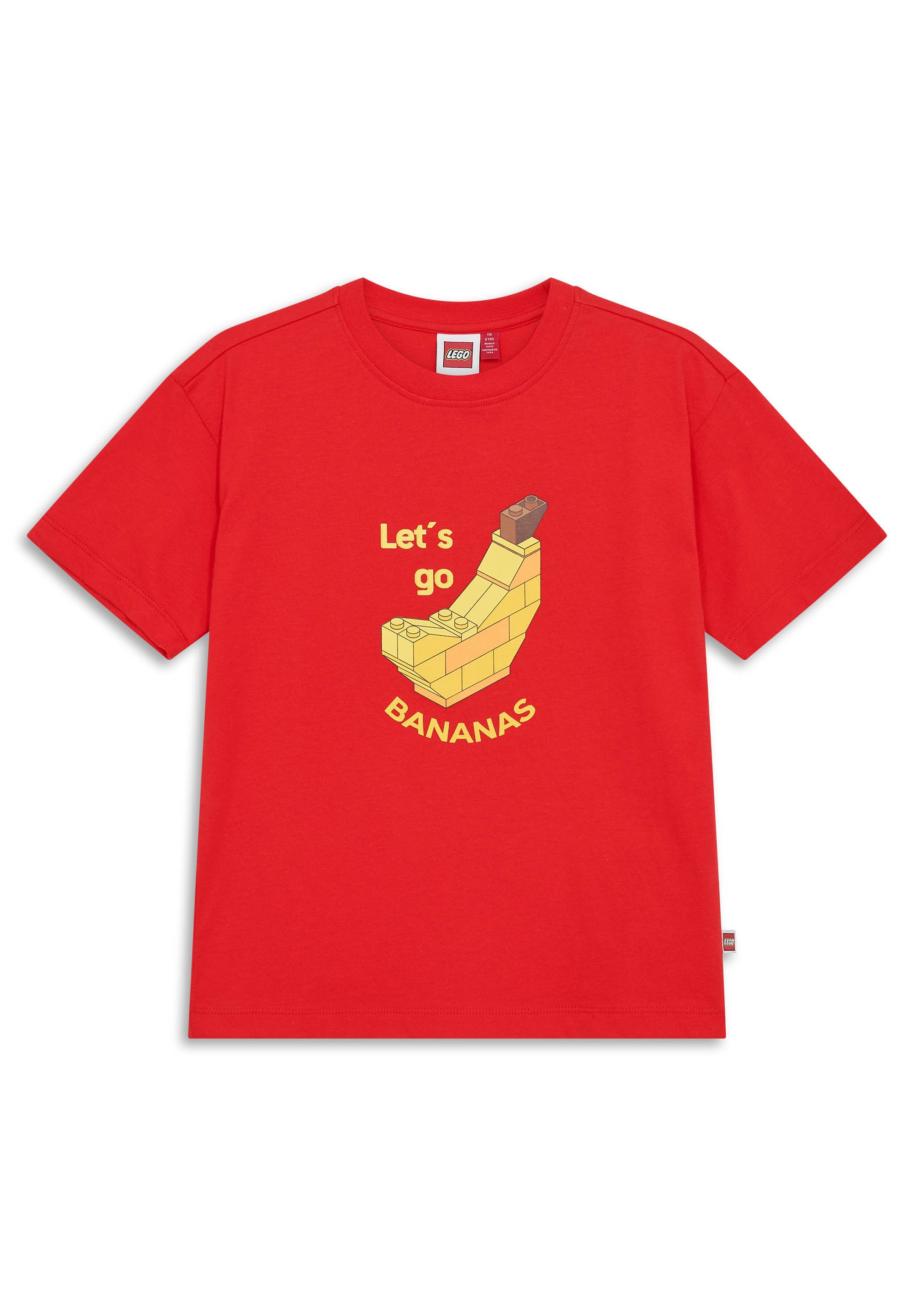 Koszulka LEGO to dziecięcy T-shirt z krótkim rękawem w intensywnej czerwieni, który dodaje stylizacjom wyrazisty, klockowy akcent. Z przodu ma centralny nadruk banana z klocków i hasło „Let’s go BANANAS”, a tył pozostaje gładki. Miękka, gładka dzianina bawełnianym charakterze i prosty krój dają wygodę przez cały dzień.