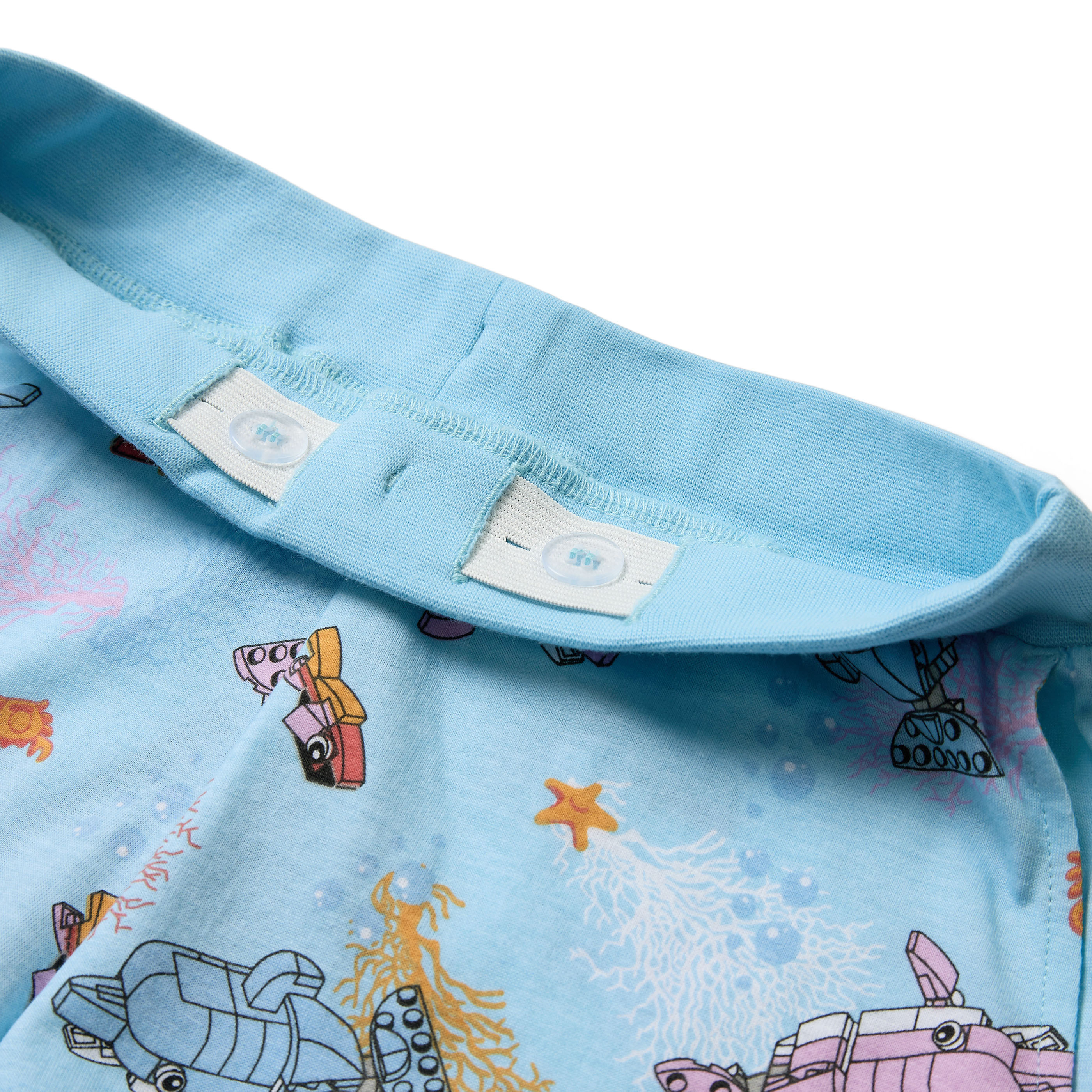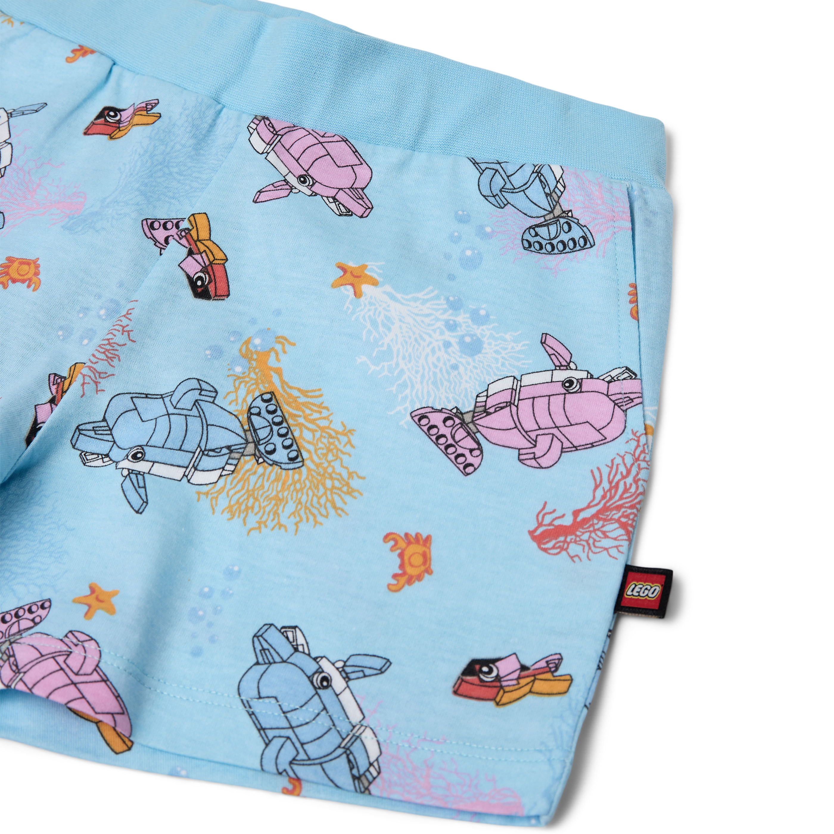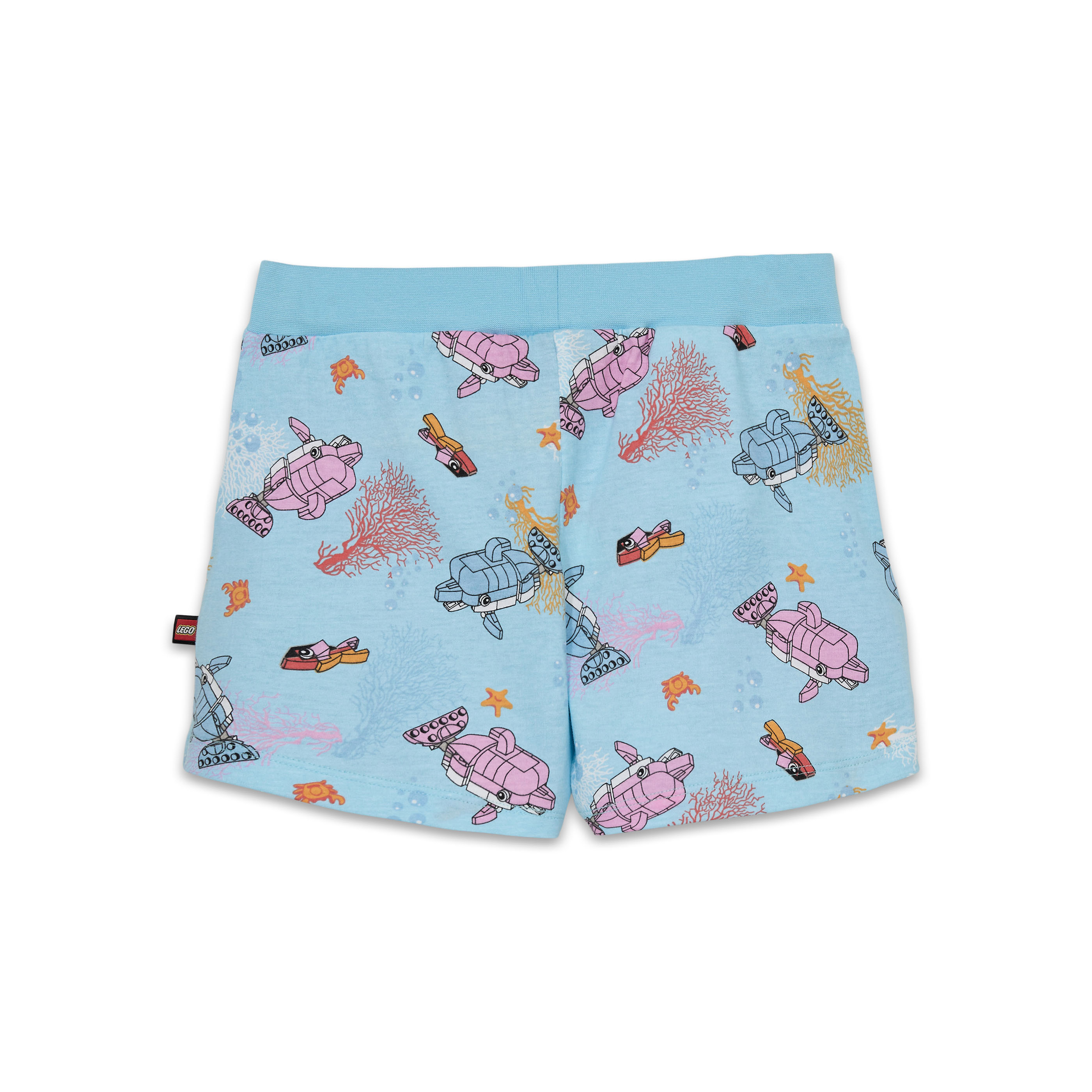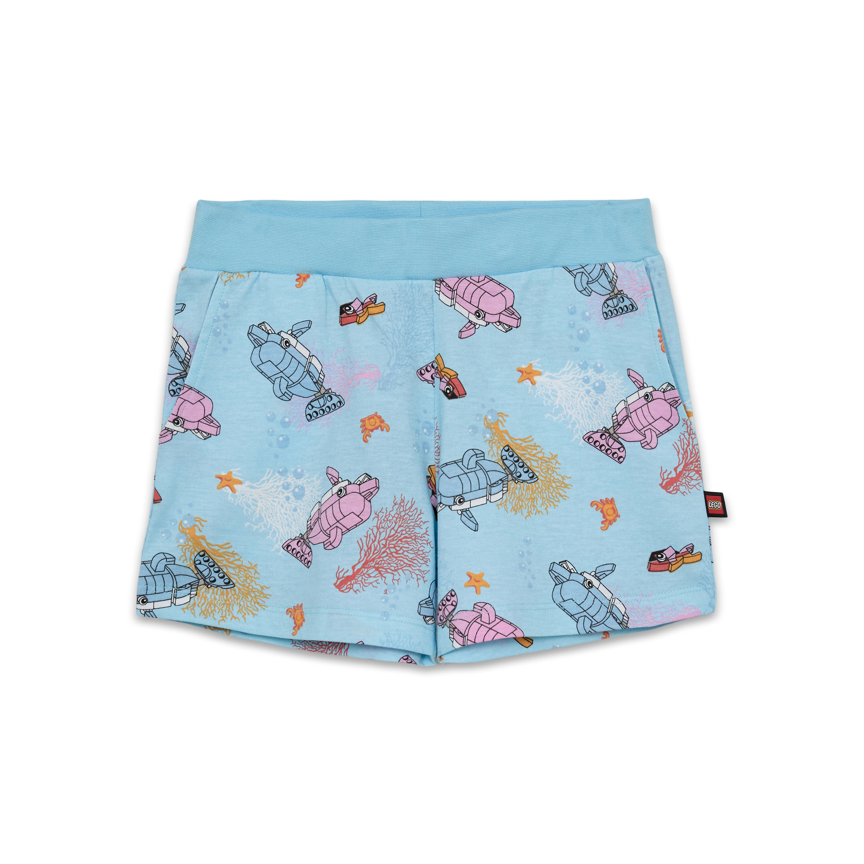 Spodenki LEGO to dziewczęce, krótkie spodenki dresowe z miękkiej dzianiny bawełnianym wyglądzie, stworzone z myślą o wygodzie na co dzień. Błękitna baza i całościowy, wielokolorowy nadruk w stylu LEGO z morskimi motywami nadają im radosny charakter i łatwo łączą się z resztą kolekcji. Szeroki, elastyczny pas ułatwia szybkie zakładanie i komfortowe dopasowanie.
