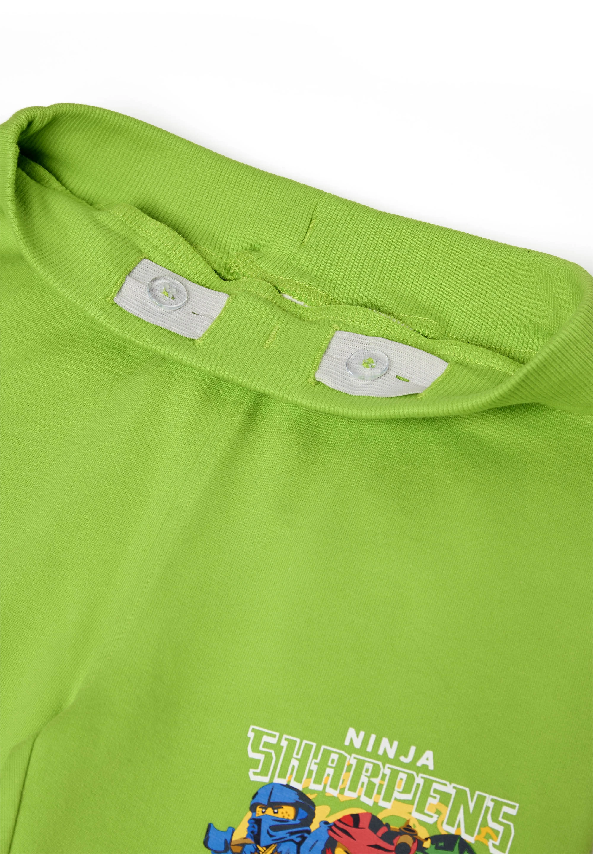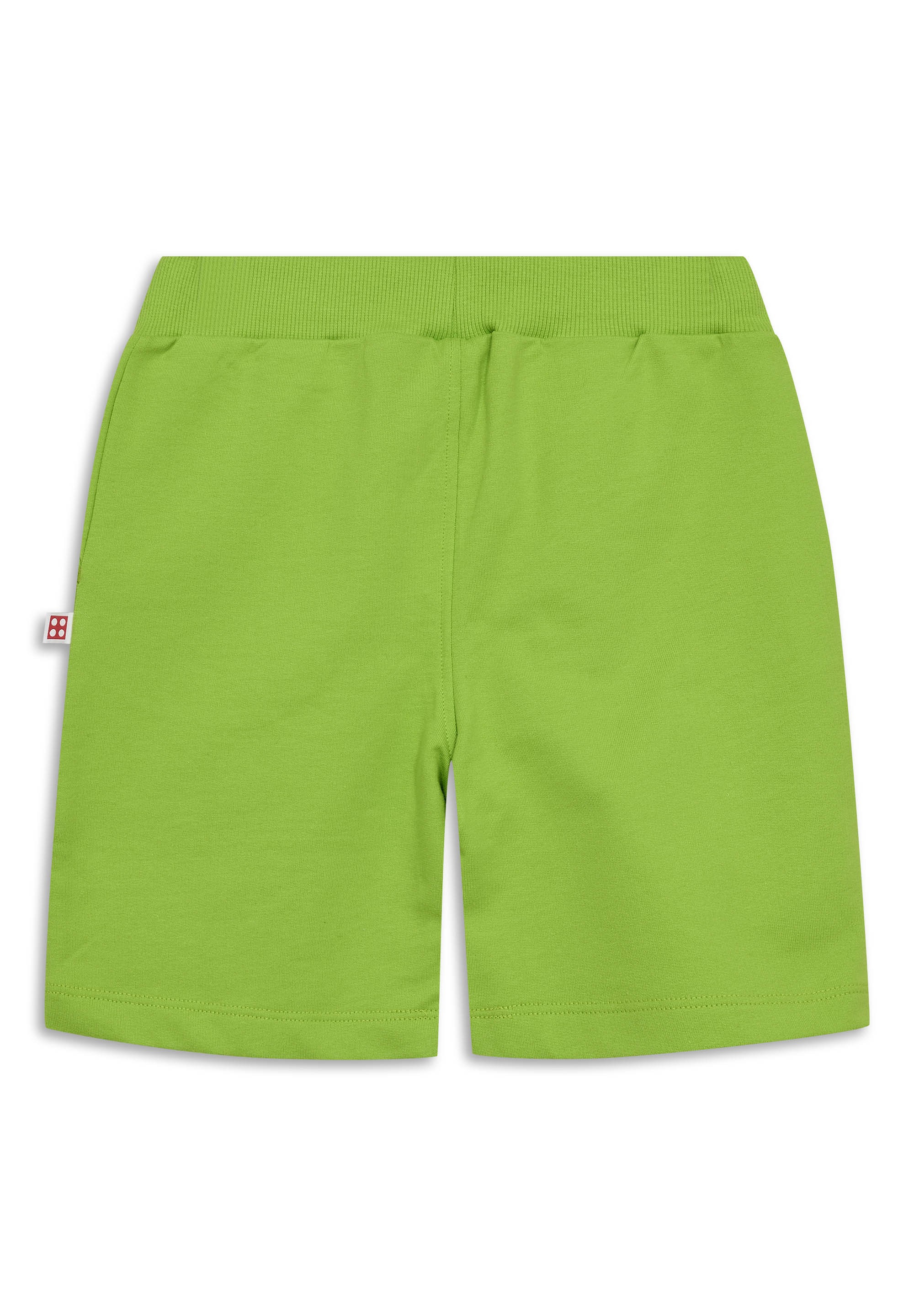 Spodenki LEGO NINJAGO to wygodne szorty dla chłopców stworzone do codziennej zabawy i odpoczynku. Miękka dzianina dresowa z nieczesaną stroną wewnętrzną daje przyjemne uczucie na skórze, a limonkowy kolor i nadruk z postaciami ninja dodają energii stylizacji. Regularny krój i nogawki do kolan zapewniają swobodę ruchu.