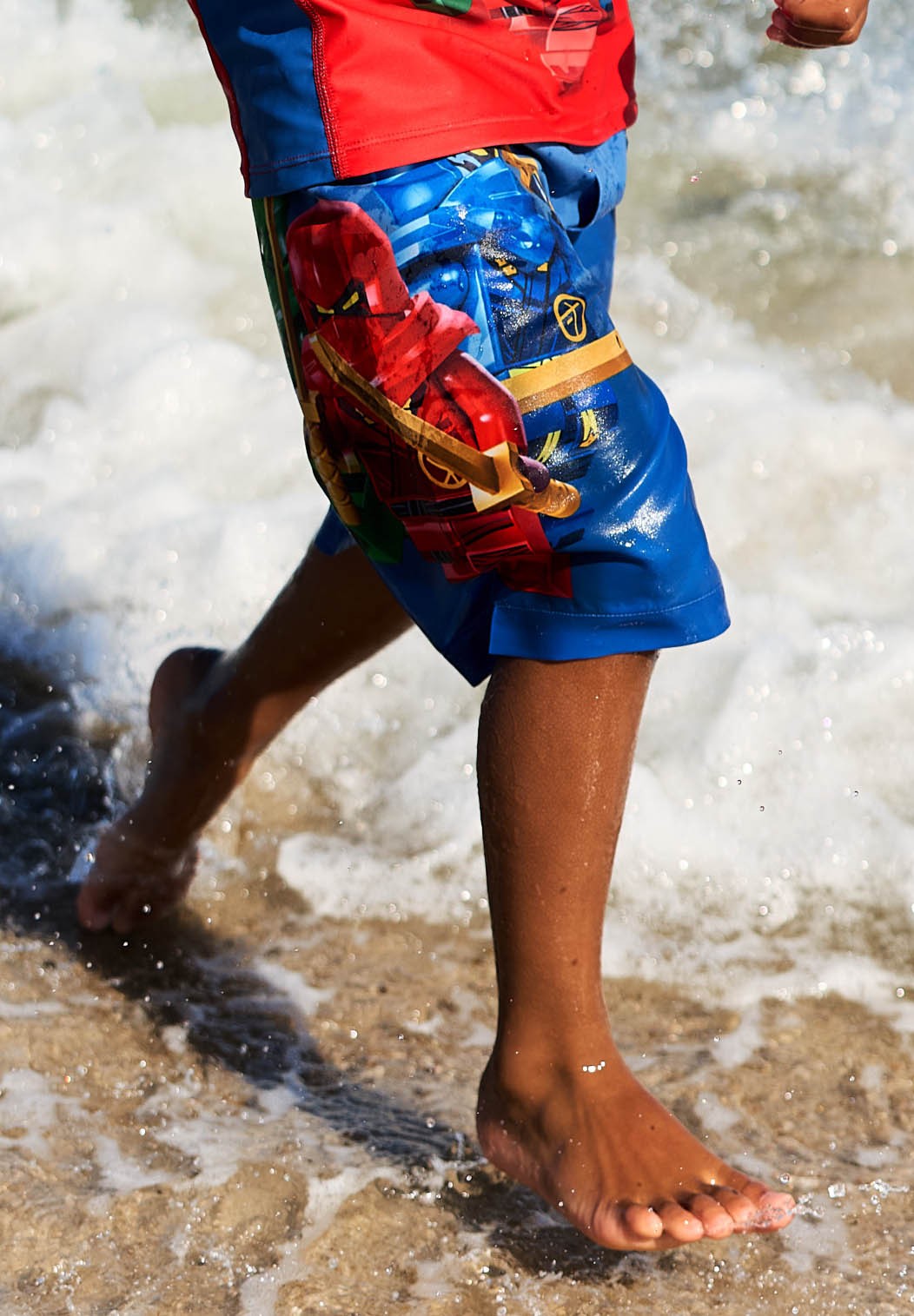 Szorty kąpielowe LEGO® NINJAGO® to chłopięce spodenki na basen i plażę z ochroną przeciwsłoneczną UPF 40+. Niebieska baza z dużym, pełnokolorowym nadrukiem postaci ze świata NINJAGO dodaje energii każdej kąpieli i zabawie w wodzie. Szybkoschnący materiał oraz wewnętrzna siateczkowa podszewka pomagają utrzymać komfort także po wyjściu z wody.
