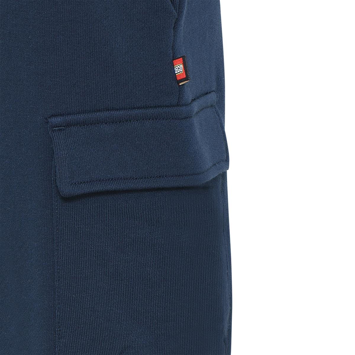 Spodnie LEGO to dziecięce spodnie dresowe w stylu bojówek (cargo), które łączą wygodę miękkiej dzianiny praktycznymi kieszeniami na udach. Granatowy, jednokolorowy wygląd łatwo dopasujesz do codziennych zestawów, a elastyczny pas ze sznurkiem pomaga szybko dobrać obwód. Ściągacze przy kostkach sprawiają, że nogawki trzymają się na miejscu podczas zabawy.