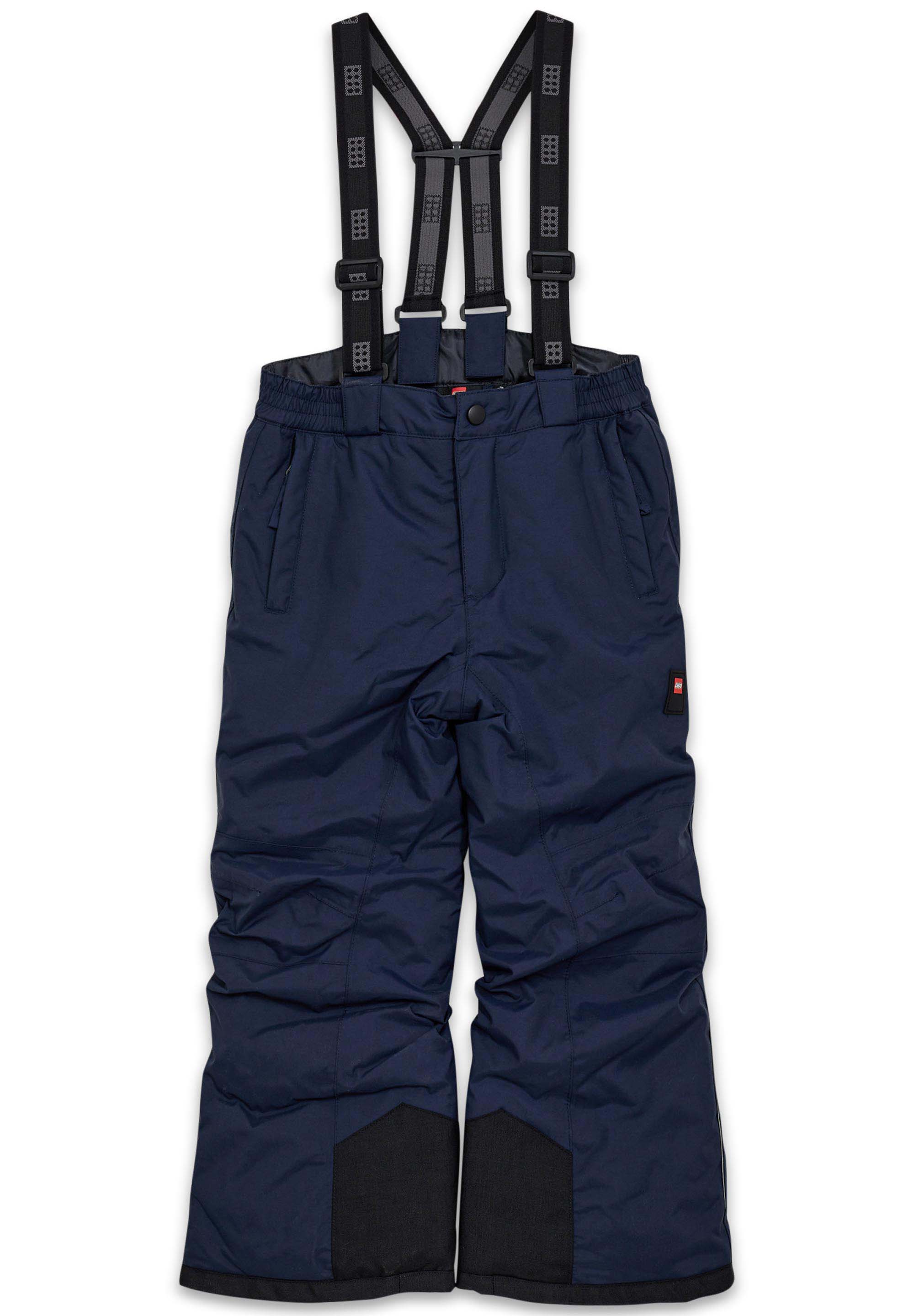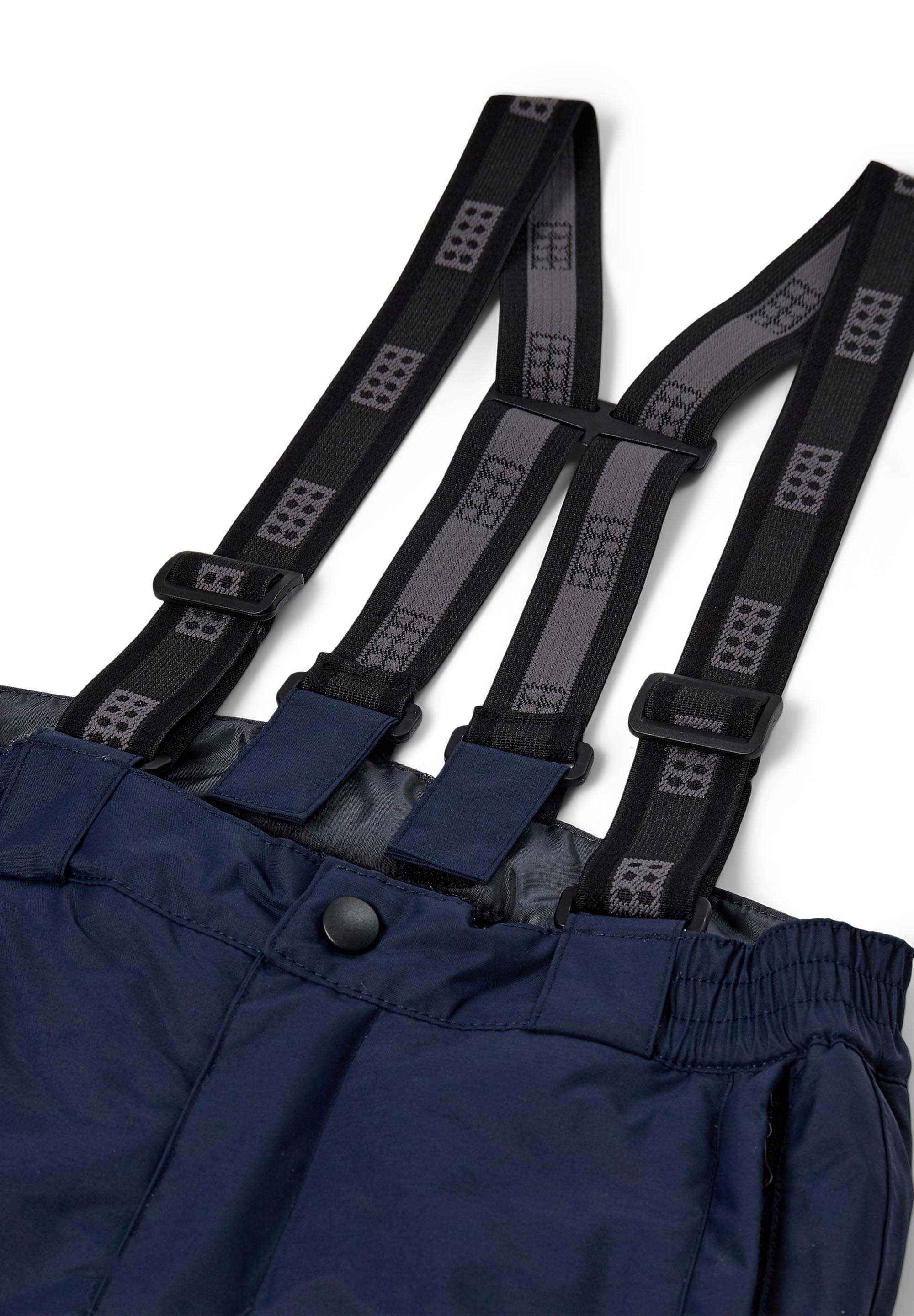 Spodnie narciarskie LEGO z linii PLAY to dziecięce ogrodniczki w granatowym kolorze z czarnymi wzmocnieniami, stworzone do zabawy na świeżym powietrzu zimą. Wysoki stan z odpinanymi, regulowanymi i elastycznymi szelkami ułatwia dopasowanie, a proste, lekko luźne nogawki dają swobodę ruchu. To model z wodoodpornością 12 000 mm i klejonymi szwami, więc pomaga utrzymać sucho w kontakcie ze śniegiem.
