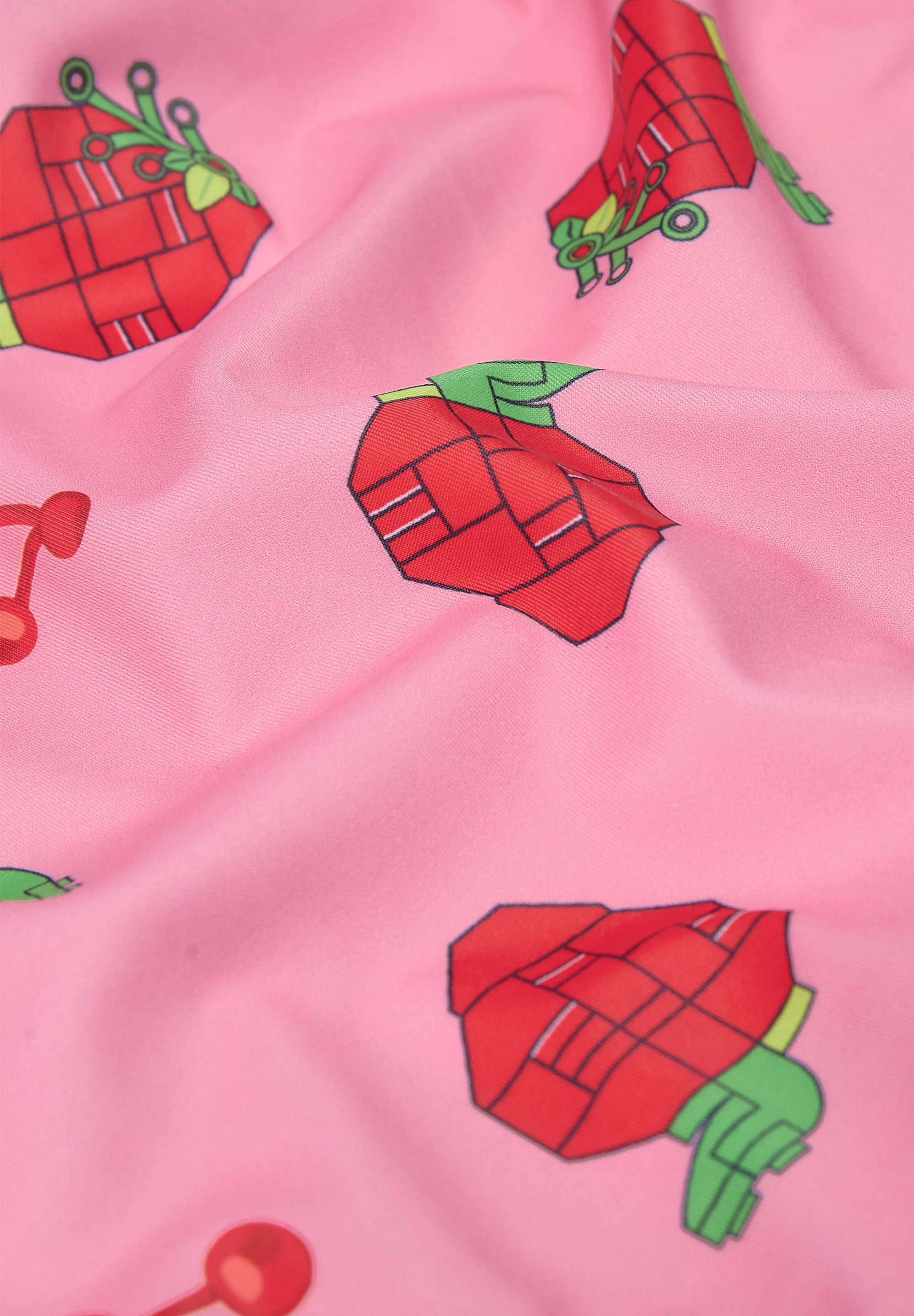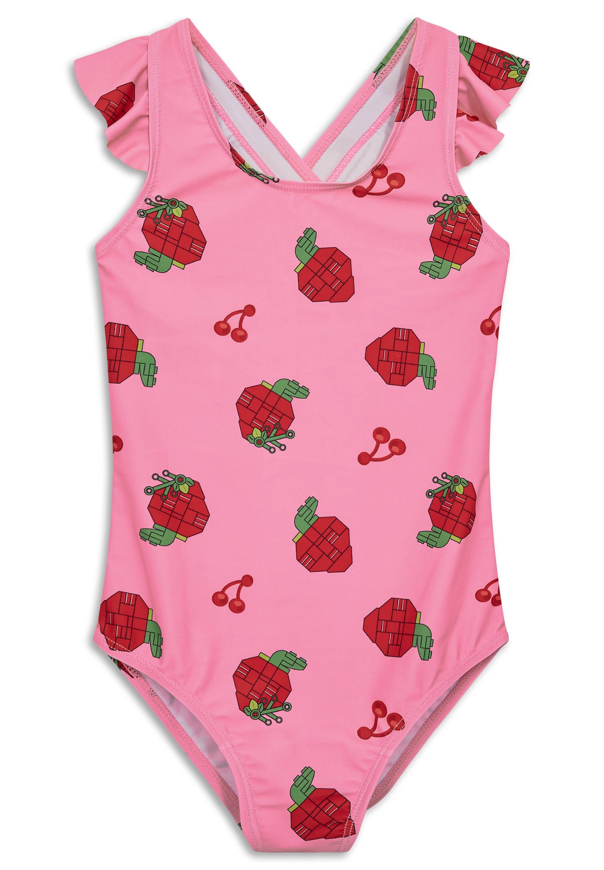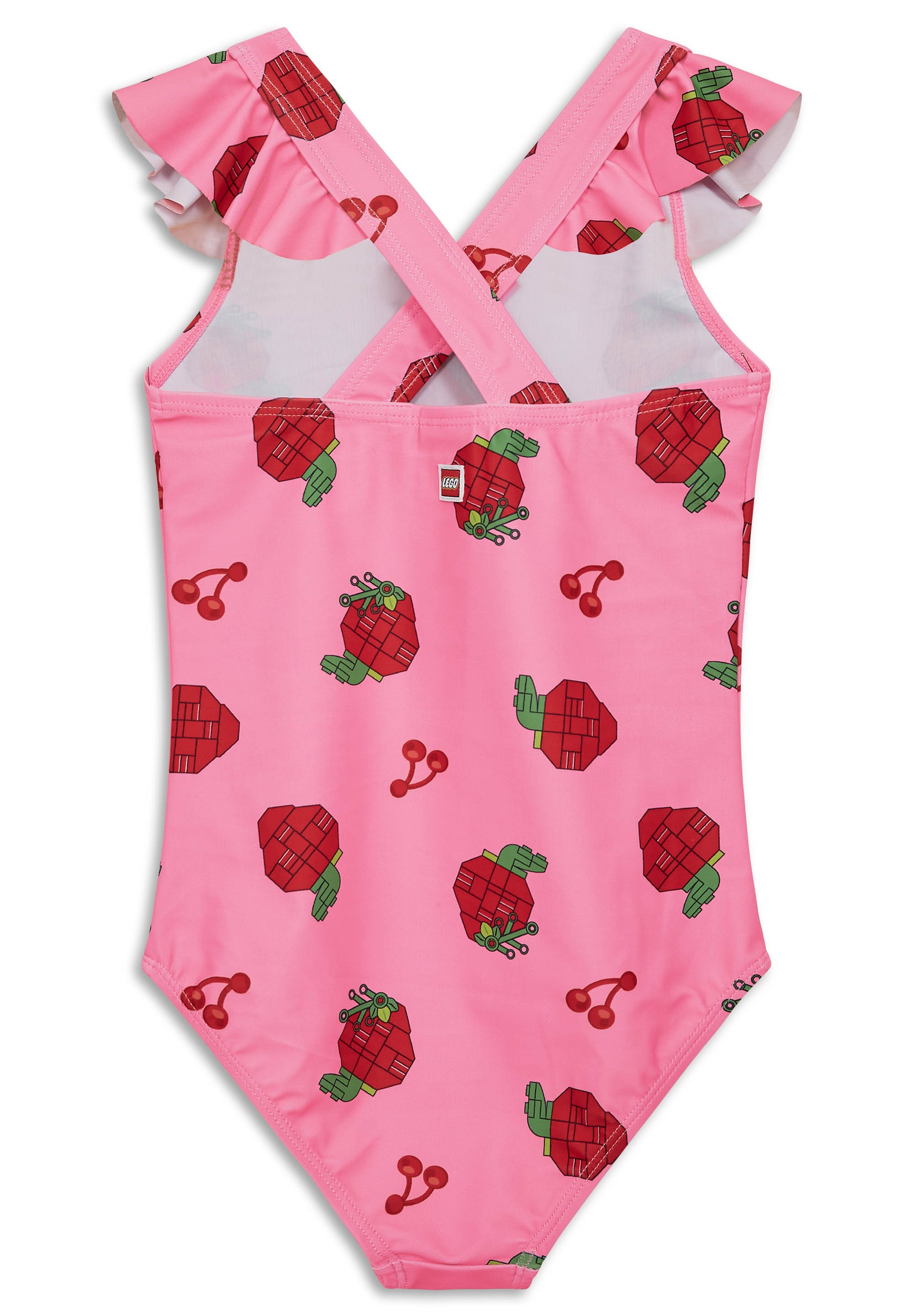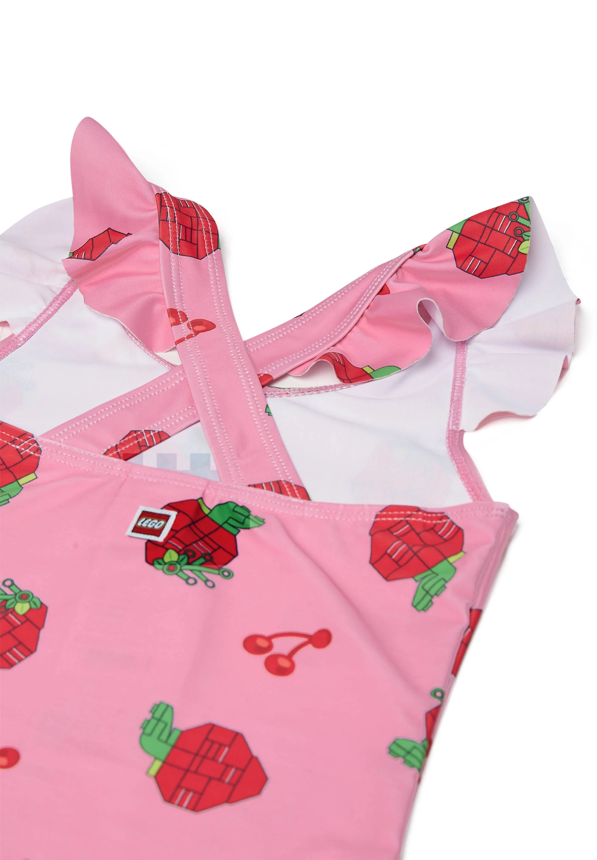Strój kąpielowy LEGO dla dziewczynki to jednoczęściowa propozycja na basen i plażę, stworzona do letniej zabawy w wodzie. Różowy kolor łączy się z owocowym nadrukiem na całej powierzchni (w tym motywami wiśni w stylu LEGO) oraz falbankami na ramionach, które dodają całości uroku. Dopasowany krój z dekoltem w kształcie litery U i skrzyżowanymi ramiączkami na plecach ułatwia swobodne ruchy podczas pływania i zabaw.