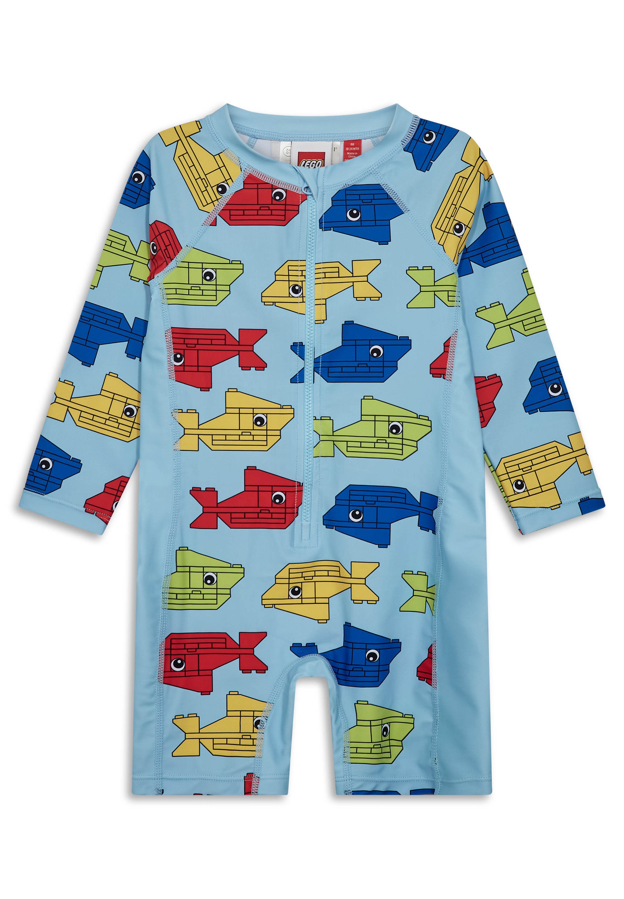 Strój kąpielowy LEGO dla chłopców z długim rękawem to wygodny, jednoczęściowy kostium na plażę i basen. Dopasowany krój z nogawką do okolic kolan oraz elastyczna, gładka dzianina pomagają zachować swobodę ruchu podczas pływania i zabaw w wodzie. Jasnoniebieska kolorystyka i nadruk w rybki w stylu klocków LEGO dodają energii każdej letniej wyprawie.